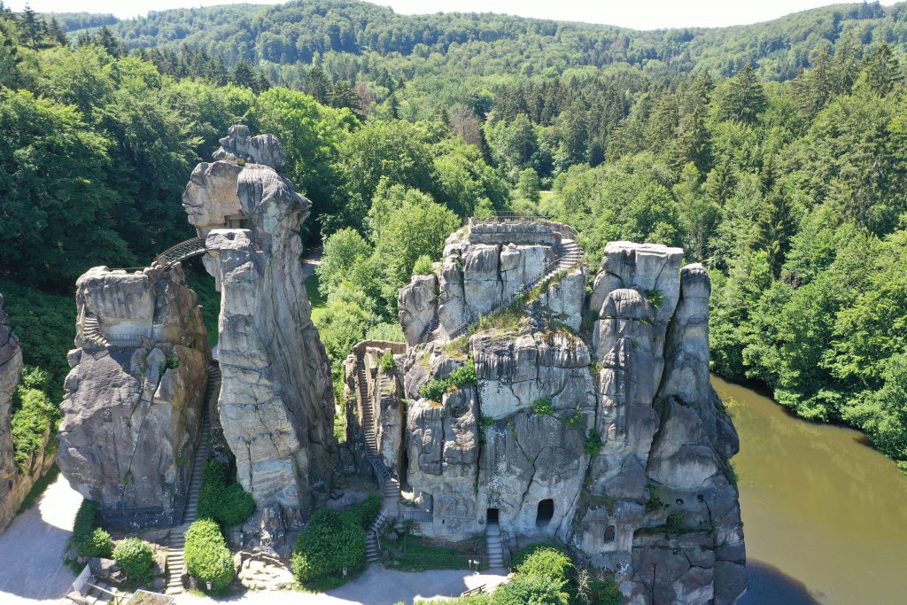 Die Externsteine sind eine markante Sandstein-Felsformation im Teutoburger Wald und als solche eine herausragende Natursehenswürdigkeit Deutschlands, die unter Natur- und Kulturdenkmalschutz steht. Die Felsen sind vom Wiembecketeich und von einer parkartigen Anlage umgeben. Die Externsteine liegen im Gebiet der Stadt Horn-Bad Meinberg im Kreis Lippe in Nordrhein-Westfalen. Ihnen werden besondere kulturgeschichtliche Bedeutungen zugeschrieben (Wikipedia).